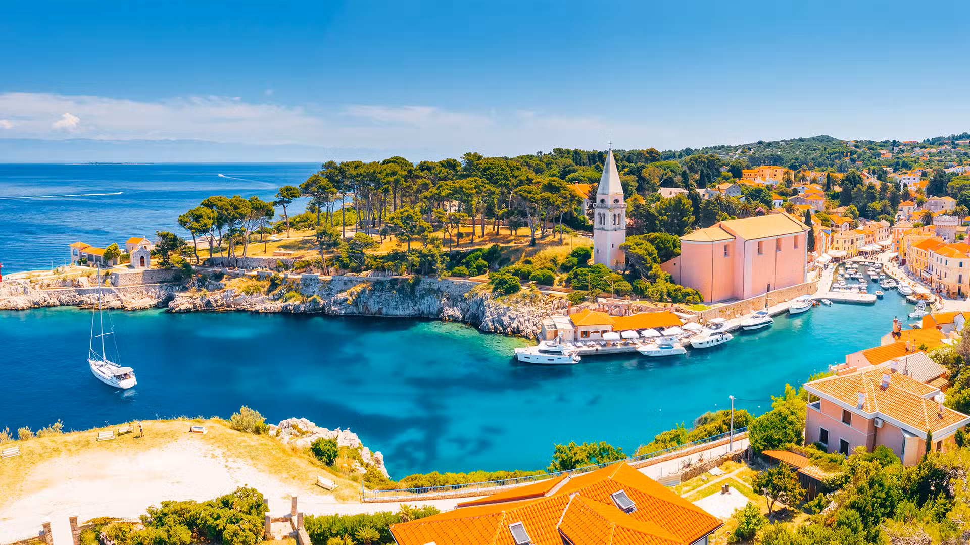 A scenic coastal village with turquoise water, boats moored at a marina, a church with a tall bell tower, lush green trees, and colourful houses with orange roofs under a clear blue sky.
