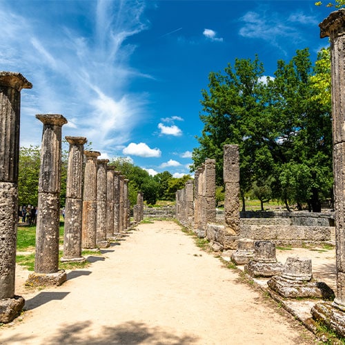 Connect with the spirit of competition and glory at ancient Olympia, the birthplace of the Olympic Games. Set in a serene valley of olive and plane trees, this is where athletes competed for nearly 1,200 years. You can wander through the ruins of the ancient gymnasium and the Palaestra where they trained, and see the fallen columns of the great Temple of Zeus, once home to one of the Seven Wonders of the Ancient World. The highlight is stepping into the original stadium and standing on the marble starting line yourself.